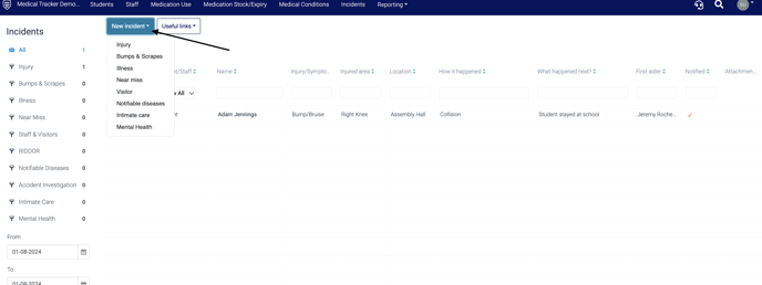 To add a new incident go to Medical Tracker and click on the Incidents module along the top.