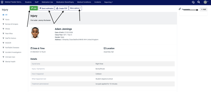 Tip: If the student has a medical condition, it will show the name of the condition on the form, so that you can click through to view any details in case they're relevant to the incident (see image above).