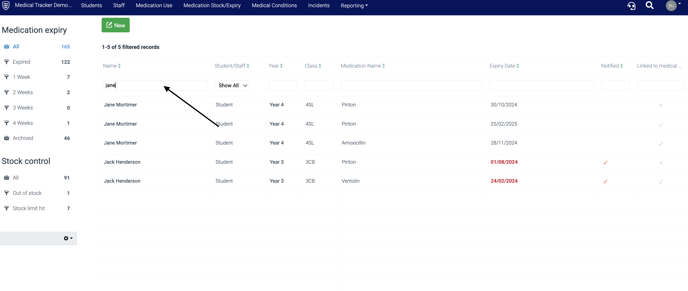 Step 2: Search for and click on the record of the student and medication that is due to expire/expired. You can search for a specific student or use the filters on the left-hand side: