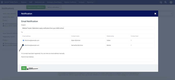- Select the contacts to whom you want to send the notification, and click 'Done'. The email will now be sent to the parents/carers from donotreply@medicaltracker.co.uk