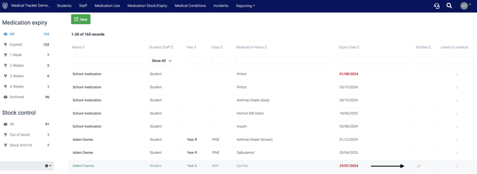 - When parents/carers have been notified, a red tick will appear on the records for medication expiry.