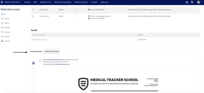 An audit trail of any communication you have had with parents/carers regarding medication expiry will be located under 'Communication'. Here you can see a log of any emails, phone calls or in-person notifications: ![]()
