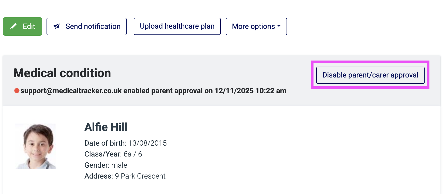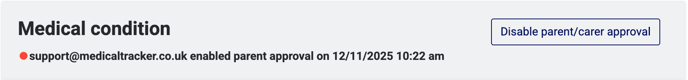 1. Click the Disable parent/carer approval button and click OK in the pop up window