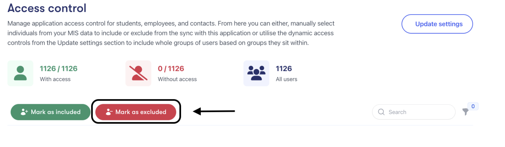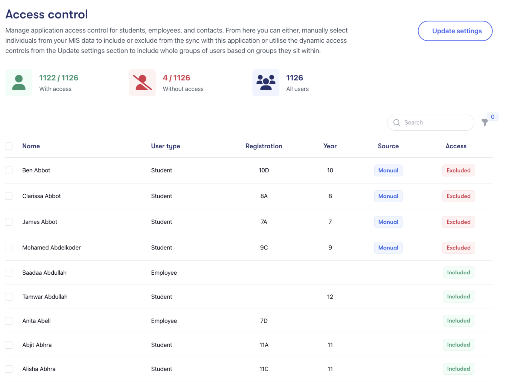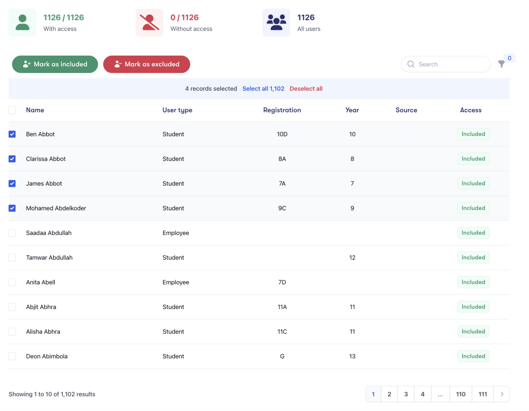 6. Once you have updated the access settings, it will take you back to the access control page. Depending on the option you have selected, you will now see a list of your users. The ‘Access’ Column will show the status as ‘Included’ or ‘Excluded’![]()