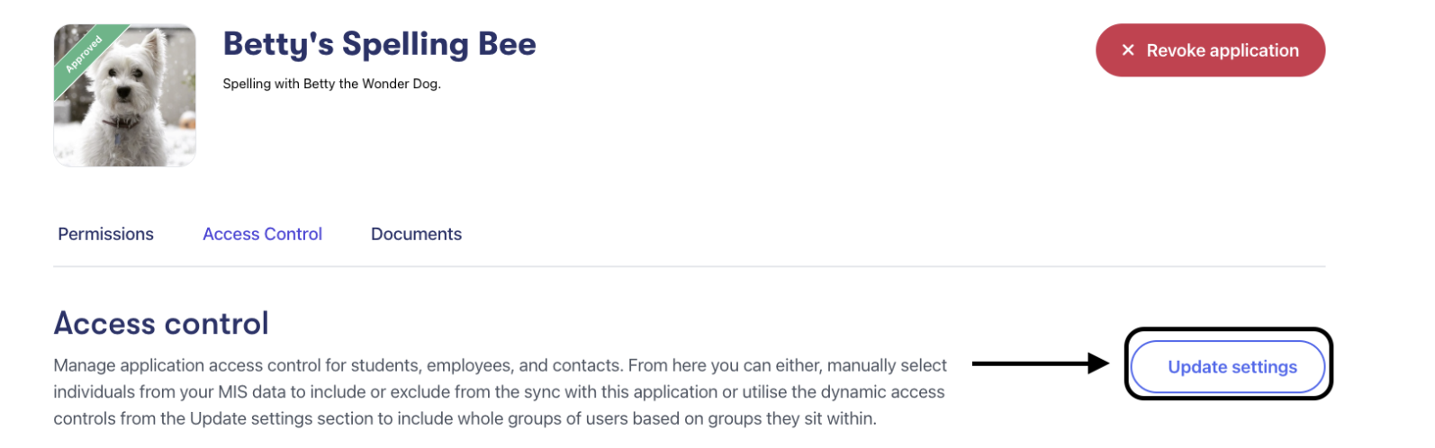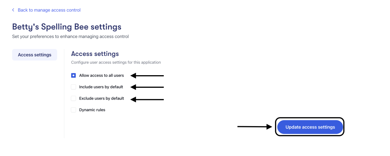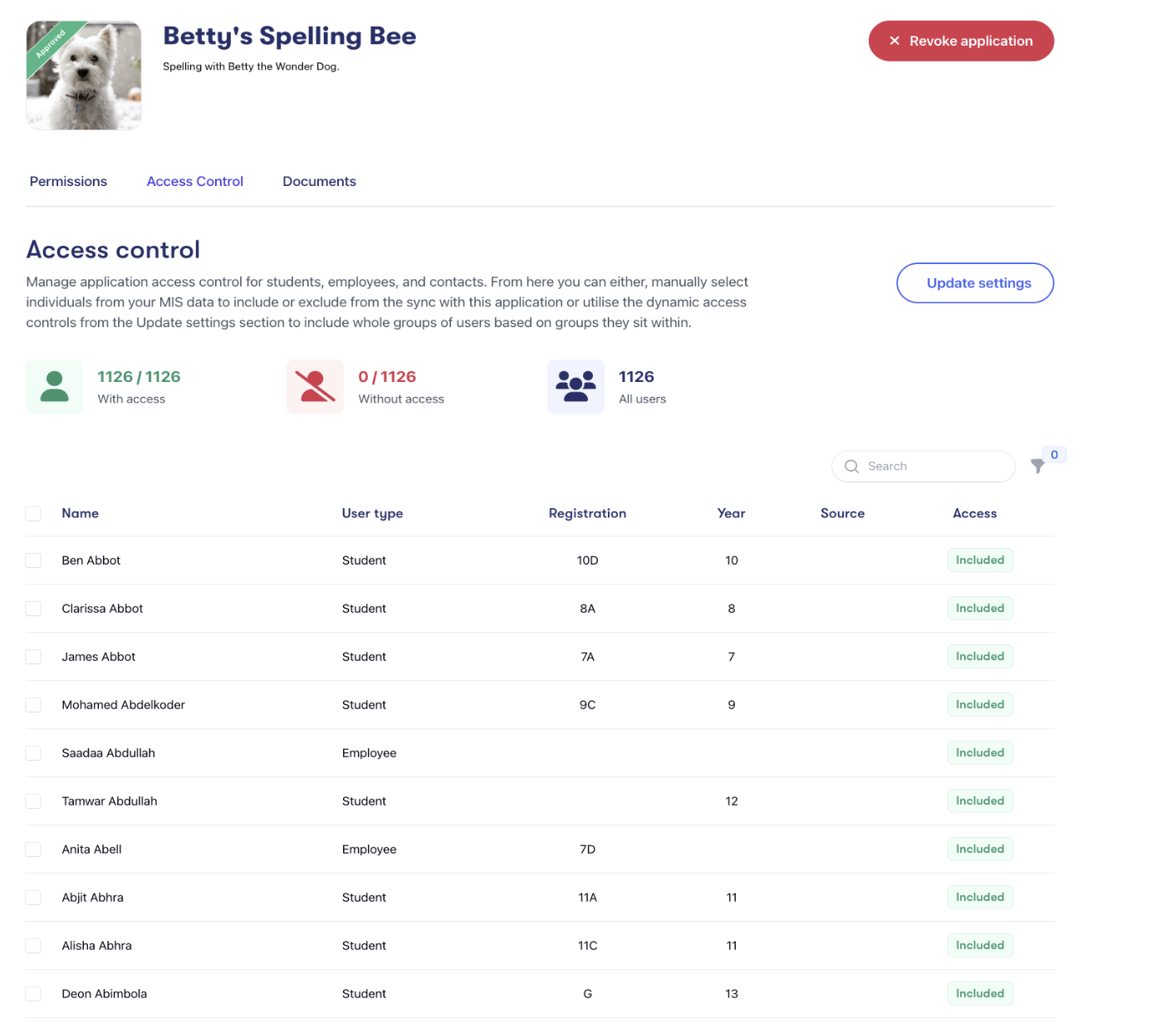 6. Once you have updated the access settings, it will take you back to the access control page. Depending on the option you have selected, you will now see a list of your users. The ‘Access’ Column will show the status as ‘Included’ or ‘Excluded’![]()