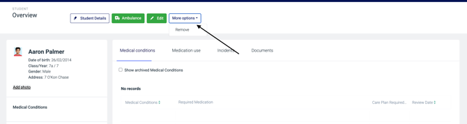 (∫Please note - if you do not have the function for this, this will be due to the active connection you have with your school MIS through either Wonde or Groupcall. Please make the changes in your school MIS to off-roll this student. Student records will be removed from Medical Tracker 7 days after they have been removed from the School MIS)